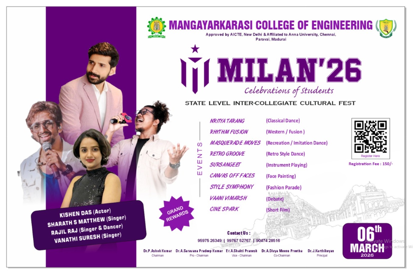 MANGAYARKARASI COLLEGE OF ENGINEERING is under the aegis of Mangayarkarasi Educational Trust which is striving in the field of education for the last seventy five years in Madurai, the cultural capital of Tamil Nadu.