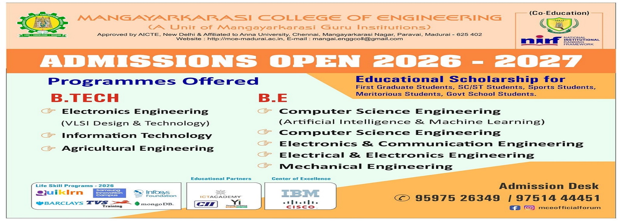 MANGAYARKARASI COLLEGE OF ENGINEERING is under the aegis of Mangayarkarasi Educational Trust which is striving in the field of education for the last seventy five years in Madurai, the cultural capital of Tamil Nadu.